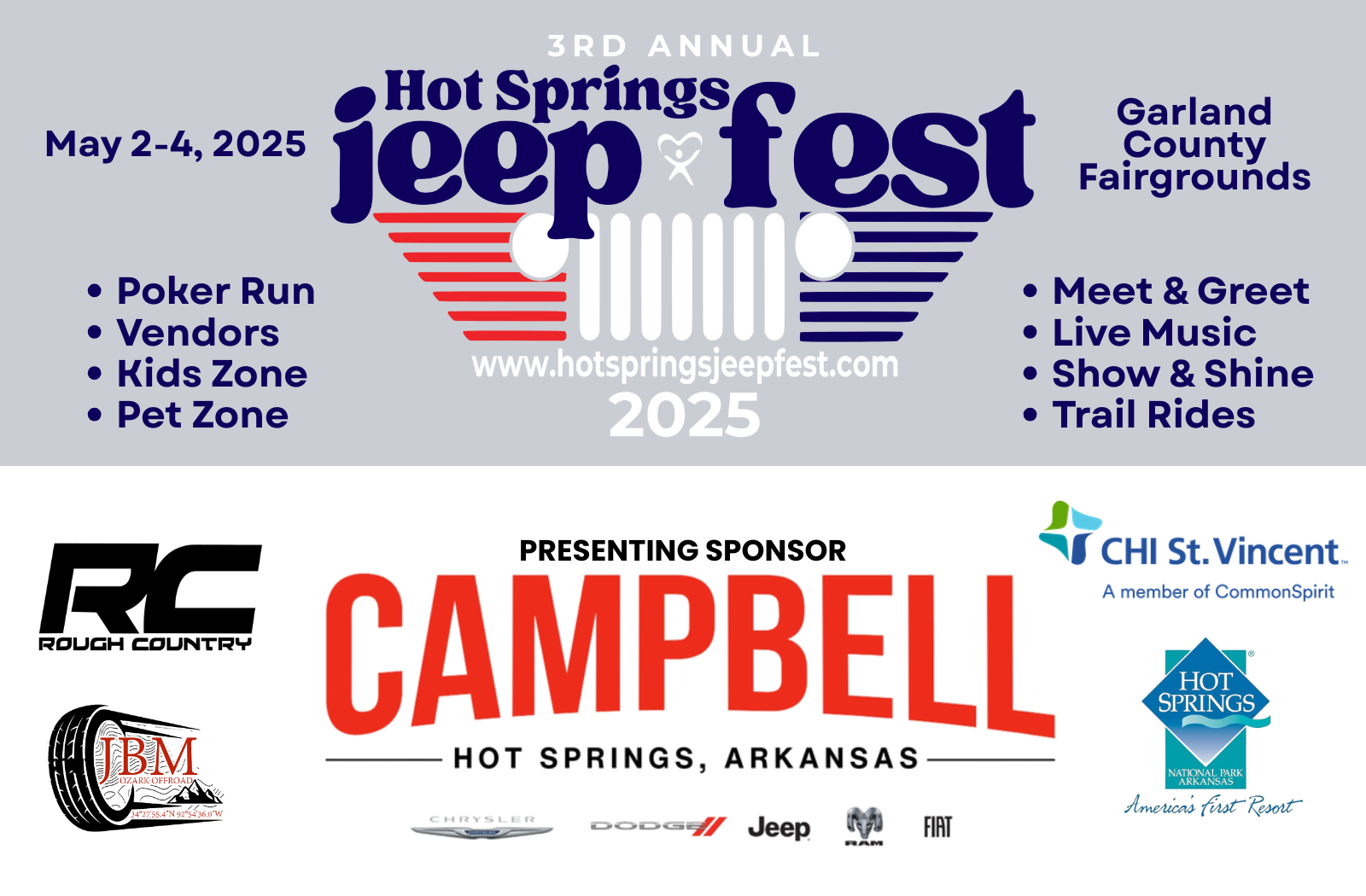 Join us in the scenic heart of Hot Springs National Park, Arkansas, for the 3rd Annual Hot Springs Jeep Fest—a family-friendly celebration of all things Jeep! This exciting event takes place at the Garland County Fairgrounds and promises a weekend full of off-road fun, community spirit, and unforgettable memories!